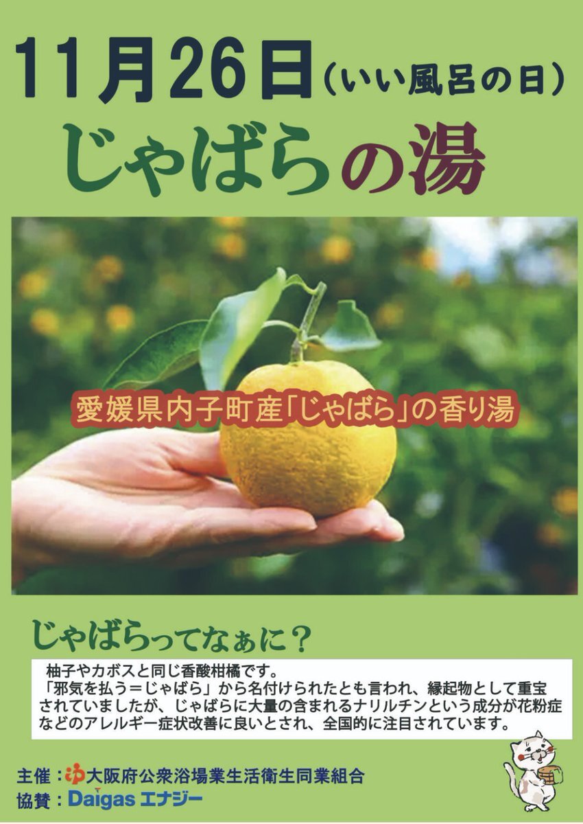 ども❗️#日の本湯 です 本日11月26日 #いい風呂の日 と言う事で #じゃばらの湯 やってまっせ〜♨️ 天気もどんよりとちょい冷えなんで、邪気を払うついでにぬくぬくと温まりに来てくださーいね ご来湯お待ちしております🙇‍♂️ #銭湯 #サウナ #じゃばら #守口市 pic.x.com/0Hb3v1JoUZ