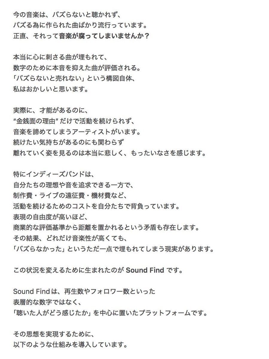 〜Sound Findの簡単なご説明〜 少しでもご興味、理念に共感いただいた方はSound Find公式アカウントのフォロー、こちらの投稿RPのご協力よろしくお願いします。 また、11/30のイベントのご参加もお待ちしております。 x.com/c_ya2moro/stat…