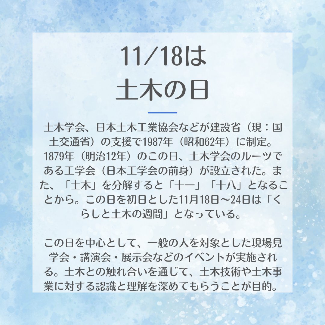 今日は「土木の日」🏗️ 1879年のこの日に、土木学会のルーツとなる「工学会」が設立されました。 「土木」を分けると「十一」「十八」となることから、11月18日に✨ 道路や橋、ダムなど、私たちの暮らしを支える土木技術に感謝する日です。 #土木の日 #インフラ #建設 #土木学会 #感謝の日 #日本の技術 pic.x.com/5knOCeH4m7