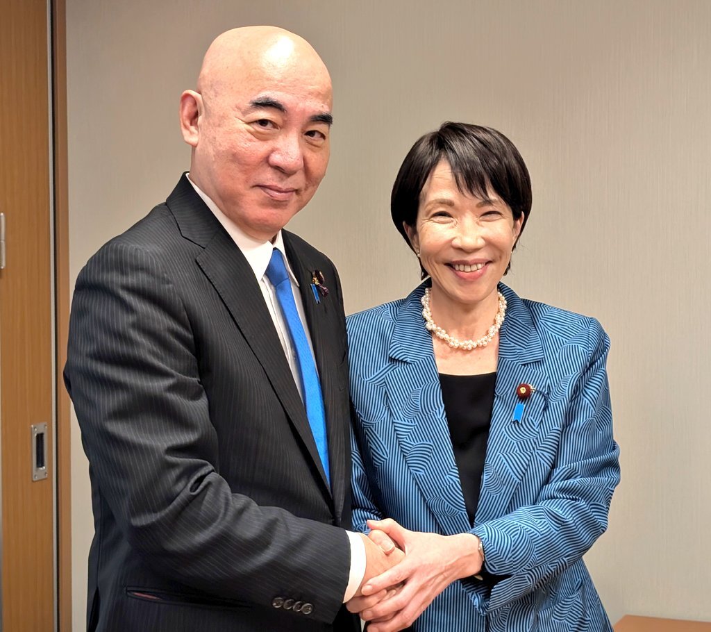 自民党の高市早苗総裁、鈴木俊一幹事長がお訪ねくださり、#保守党 百田尚樹代表と会談しました。百田代表から総裁ご就任のお祝いを申し上げ、高市総裁から「国家観において共通している。政策実現に向け協力を」とのお話がありました。 「百田先生、普段の格好と違ってシュッとしててビックリ」とも