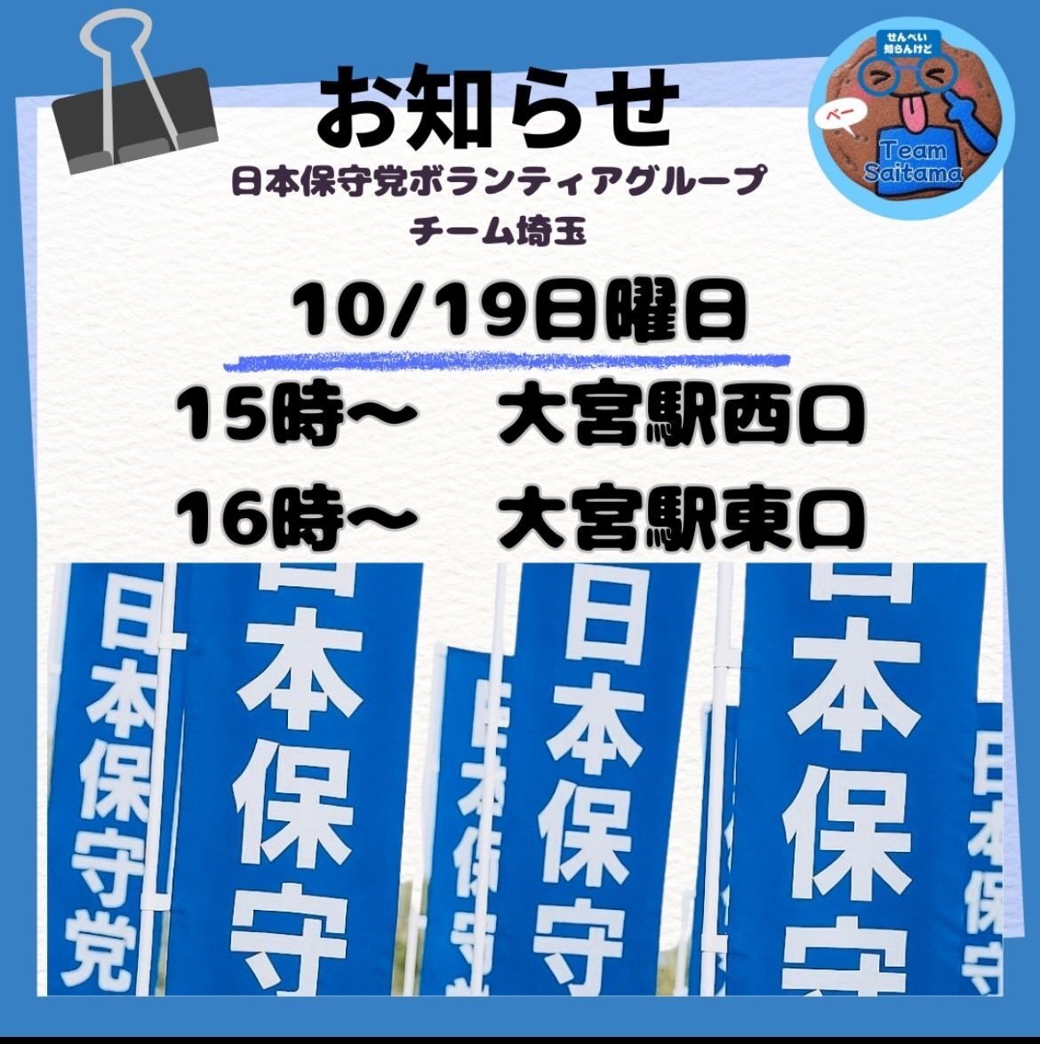 【📣10/19(日)埼玉・保守活のお知らせです🥰】 ★お近くにお住まいの皆さん、ご協力・ご参加宜しくお願い致します🙇‍♀️ #日本保守党 #北関東から日本を豊かに強く #チーム埼玉