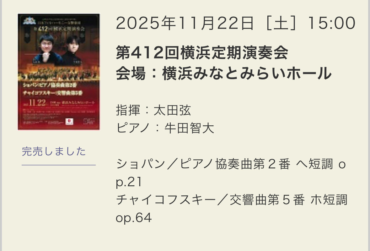 11/22 第412回横浜定期演奏会 みなとみらいホール 完売しました🎉 #牛田智大 さん #日本フィルハーモニー交響楽団 pic.x.com/XZvz5Z7MOG x.com/northpole1226/…