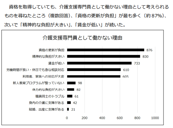 これは貴重なデータですね。 こういう調査と結果公表を #日本介護支援専門員協会 ができない理由はなぜでしょう? >介護支援専門員として働かない理由として考えられるものを尋ねたところ「資格の更新が負担」が最も多く(約87%) #ケアマネ #静岡グッジョブ pic.x.com/N5gGrS8eqL x.com/5252net/status…