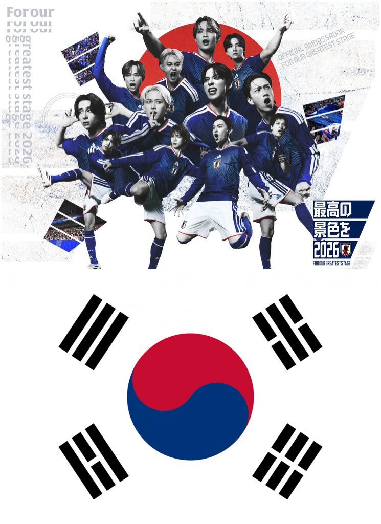 【太極旗に酷似】日本代表について、韓国資本の入った芸能事務所のグループを公式アンバサダー起用するに留まらず、イメージポスターは太極旗を連想させる構成 誰の差し金でこんな事になったのか。経緯を明らかにした上で見直しを! x.com/jfa_samuraiblu…