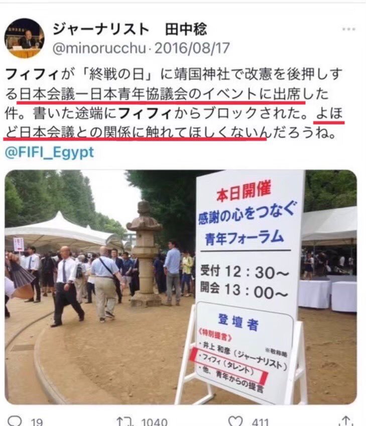 フィフィが「終戦の日」に靖国神社で改憲を後押しする日本会議ー日本青年協議会のイベントに出席した件。書いた途端にフィフィからブロックされた。よほど日本会議との関係に触れてほしくないんだろうね。@FIFI_Egypt