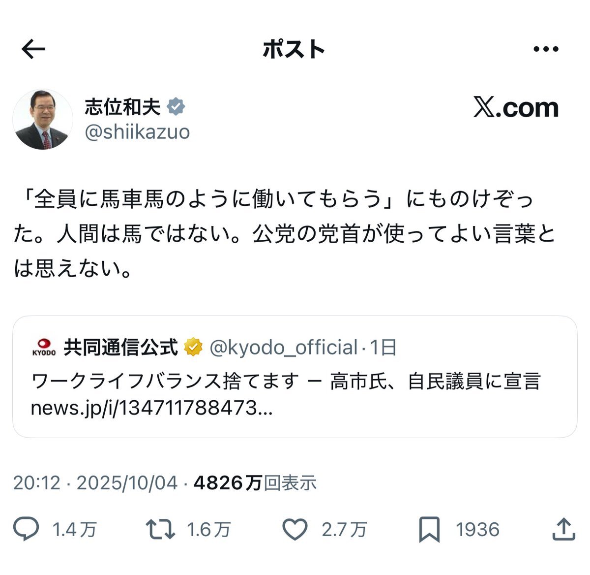 【悲報】 日本共産党 志位和夫氏 『「全員に馬車馬のように働いてもらう」にものけぞった。人間は馬ではない。』 と、高市早苗氏を痛烈に批判 ↓ ・しんぶん赤旗でも「馬車馬のように働く」という表現を使っていた事が発覚 ・志位和夫氏ご本人もXで「馬の耳に念仏」と引用していた事が発覚←今ここ