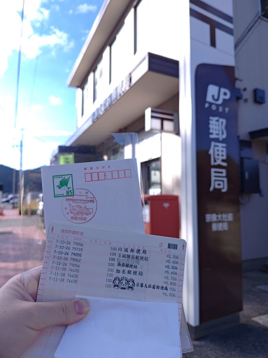 50箇所以上の郵便局スタンプ集まってきたけど、宗像大社のとこは3行使うという荒業スタイルで初体験w 1箇所に付き100円入れてて、でも今回は300円になっちゃったから200円分おろそうかしら? #日本列島2往復半の旅 pic.x.com/MVd3WncYIa