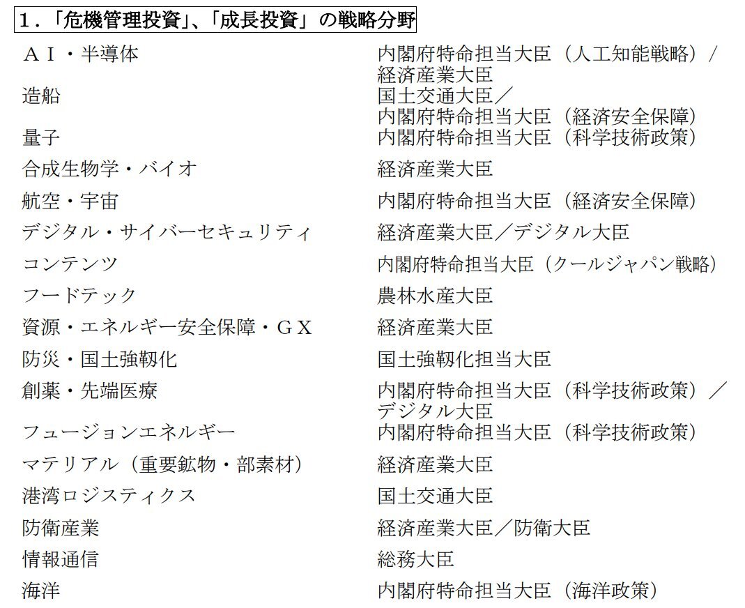 新政権は「危機管理投資」を軸に、成長分野へ官民投資を誘導する。 対象はAI・半導体、量子、バイオ、宇宙、GX、フュージョン等の広範囲。 分野ごとに担当閣僚を定め、総合支援を一気通貫で進める設計です。 この枠組みは補助金だけでなく、標準化、人材、国際展開まで包含。 #日本成長戦略本部 pic.x.com/LfZxbJM3ow