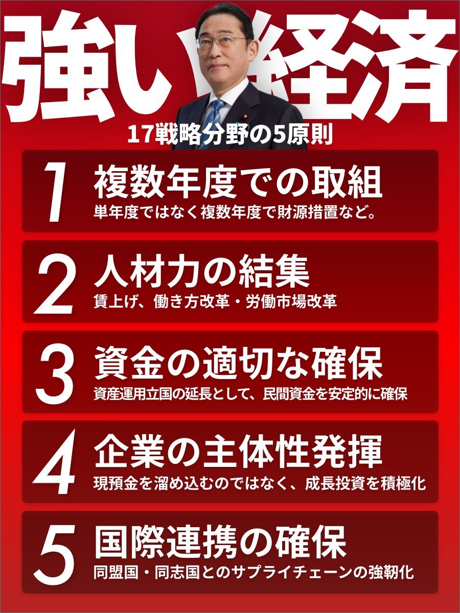 日本経済成長本部で示された「岸田5原則」。第一に複数年の取組。英仏独豪などの先進国では複数年度予算の取組は常識。第二に人材。産業集積・育成には賃上げとともにリスキリング含め人材育成、人材投資が重要。 x.com/kishida230/sta…
