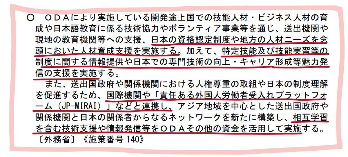 なるほどねー、つまり、JICAは今後、「支援先の国で」「日本に送り込む移民を育成する」事業に力を入れていくということですね。 ●「ODAを実施している事業を通じ...」とあるけど、JICAのことでしょ。どうしてJICAと書かないんでしょうね。 x.com/ykaneko_x/stat…