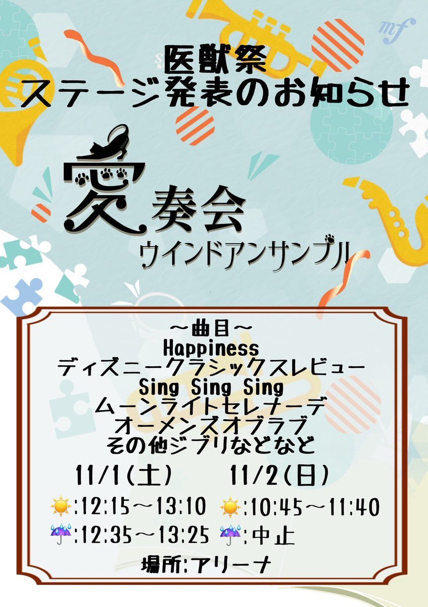 今年も医獣祭の季節になりました! HappinessやSING,SING,SINGなど様々な曲を演奏します🎵 ぜひお越しください🎶 🗓11/1(土)12:15〜, 11/2(日)10:45〜 📍アリーナ ※雨天時は時間に変更がございます。 #医獣祭 #日獣 #日本獣医生命科学大学 #愛奏会 #吹奏楽 #吹奏楽部 #文化祭 #学園祭 pic.x.com/XpivMPp3yo