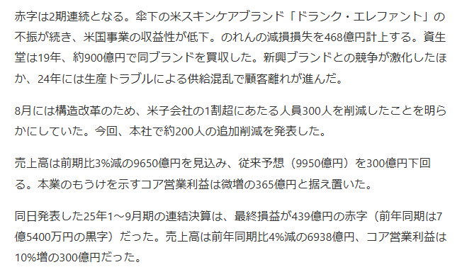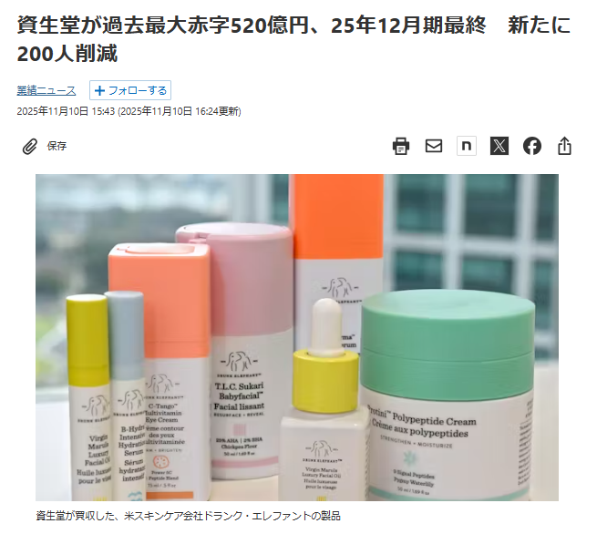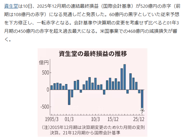 “資生堂” 資生堂は10日 2025年12月期・連結最終損益が 520億円の赤字 (過去最大)になる見通しと発表。 ※前期は108億円の赤字 ※従来予想は60億円の黒字 傘下「Drunk Elephant」の不振が続き 米国事業の収益性が低下。 のれんの減損損失を468億円計上。 #日本經濟新聞 nikkei.com/article/DGXZQO… pic.x.com/SdpeFOto62