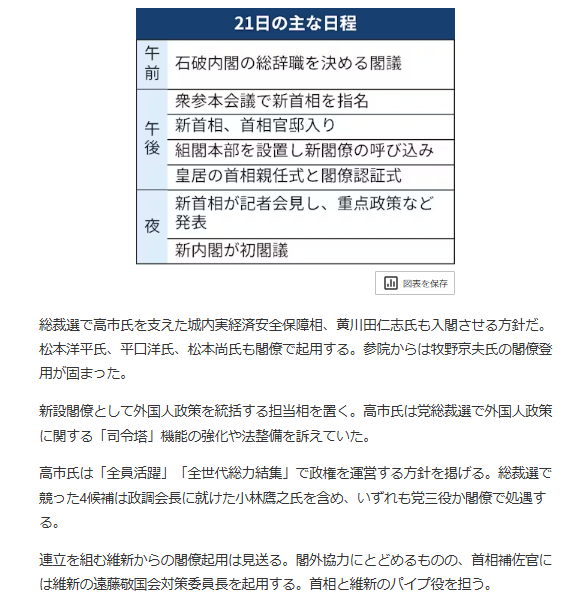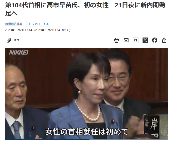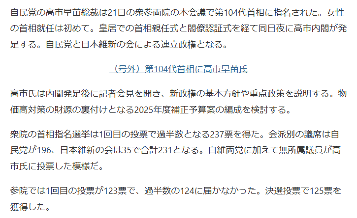 “日本・首相指名選挙” 「第104代首相」 高市早苗 氏 21日夜に「新内閣」発足へ 自民党・高市早苗総裁は 21日の衆参両院の本会議で 第104代首相に指名された。 女性の首相就任は初めて。 ▼会派別の議席 (合計231)▼ 自民党:196 / 日本維新の会:35 #日本經濟新聞 nikkei.com/article/DGXZQO… pic.x.com/628h9VrFWq