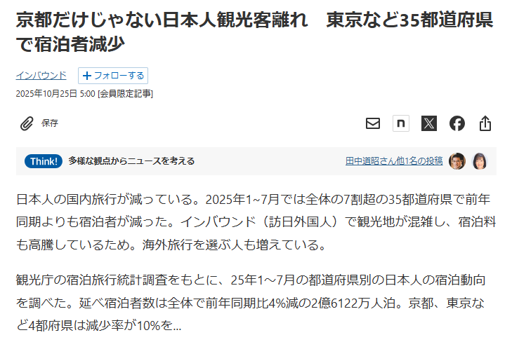 “観光庁「宿泊旅行統計調査」” 日本人の観光客離れ 東京など35都道府県で宿泊者減少 2025年1〜7月 都道府県別の日本人の宿泊動向を調査。 延べ宿泊者数は全体で 前年同期比:4%減・2億6122万人泊 訪日外国人で観光地が混雑し 宿泊料も高騰しているため。 #日本經濟新聞 nikkei.com/article/DGXZQO… pic.x.com/6CNAn9QijF