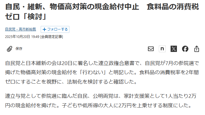 “自由民主党 / 日本維新の会” 自民党と日本維新の会は 20日に署名した連立政権合意書で 自民党が7月の参院選で掲げた 物価高対策の現金給付を 「行わない」と明記した。 食料品の消費税率を 2年間ゼロにすることを視野に 法制化を検討すると確認した。 #日本經濟新聞 nikkei.com/article/DGXZQO… pic.x.com/kXxkZazAyT