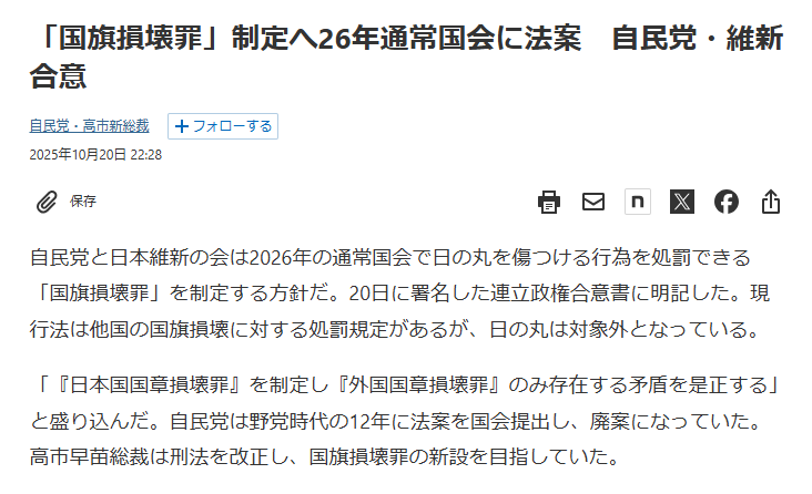 “自由民主党 / 日本維新の会” 「日本国国章損壊罪」 制定へ 自民党と日本維新の会は 2026年の通常国会で 「日の丸」を傷つける行為を処罰できる 「国旗損壊罪」を制定する方針。 20日に署名した 連立政権合意書に明記した。 #日本經濟新聞 nikkei.com/article/DGXZQO… pic.x.com/rvVI5hQ4yo