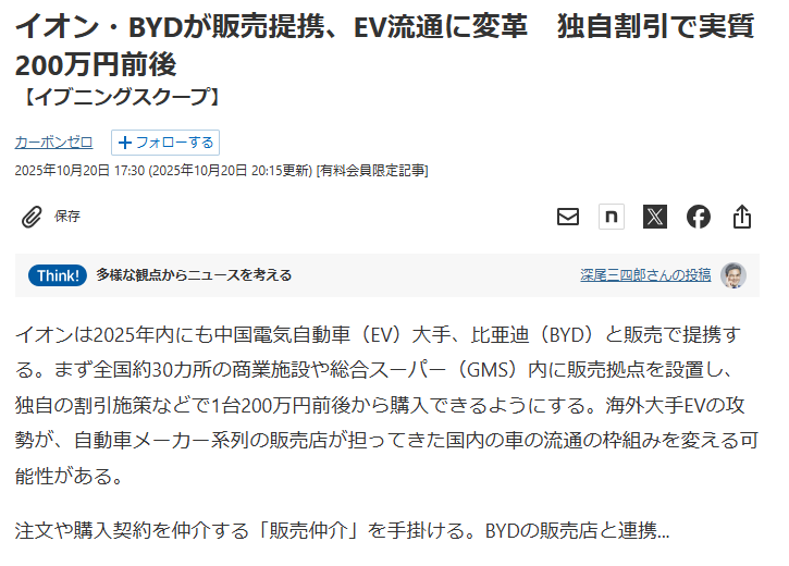 “イオン×BYD” イオンは2025年内にも 中国電気自動車(EV)大手 「比亜迪 (BYD)」と販売で提携する。 全国約30カ所の 商業施設や総合スーパー内に 販売拠点を設置し 独自の割引施策などで 1台200万円前後から 購入できるようにし 「販売仲介」を手掛ける。 #日本經濟新聞 nikkei.com/article/DGXZQO… pic.x.com/EK0QODhRbU