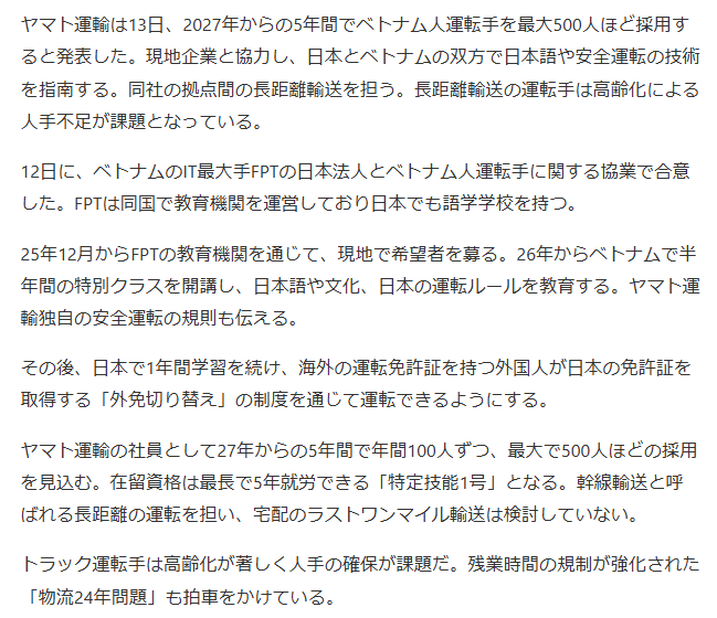 “ヤマト運輸” ヤマト運輸は12日に ベトナムのIT最大手「FPT」の日本法人と ベトナム人運転手に関する協業で合意し 2027年からの5年間で ベトナム人運転手を 最大500人ほど採用する。 日本とベトナムで 日本語や安全運転の技術を指南し 長距離輸送を担う。 #日本經濟新聞 nikkei.com/article/DGXZQO… pic.x.com/pq0ZLPlc1k