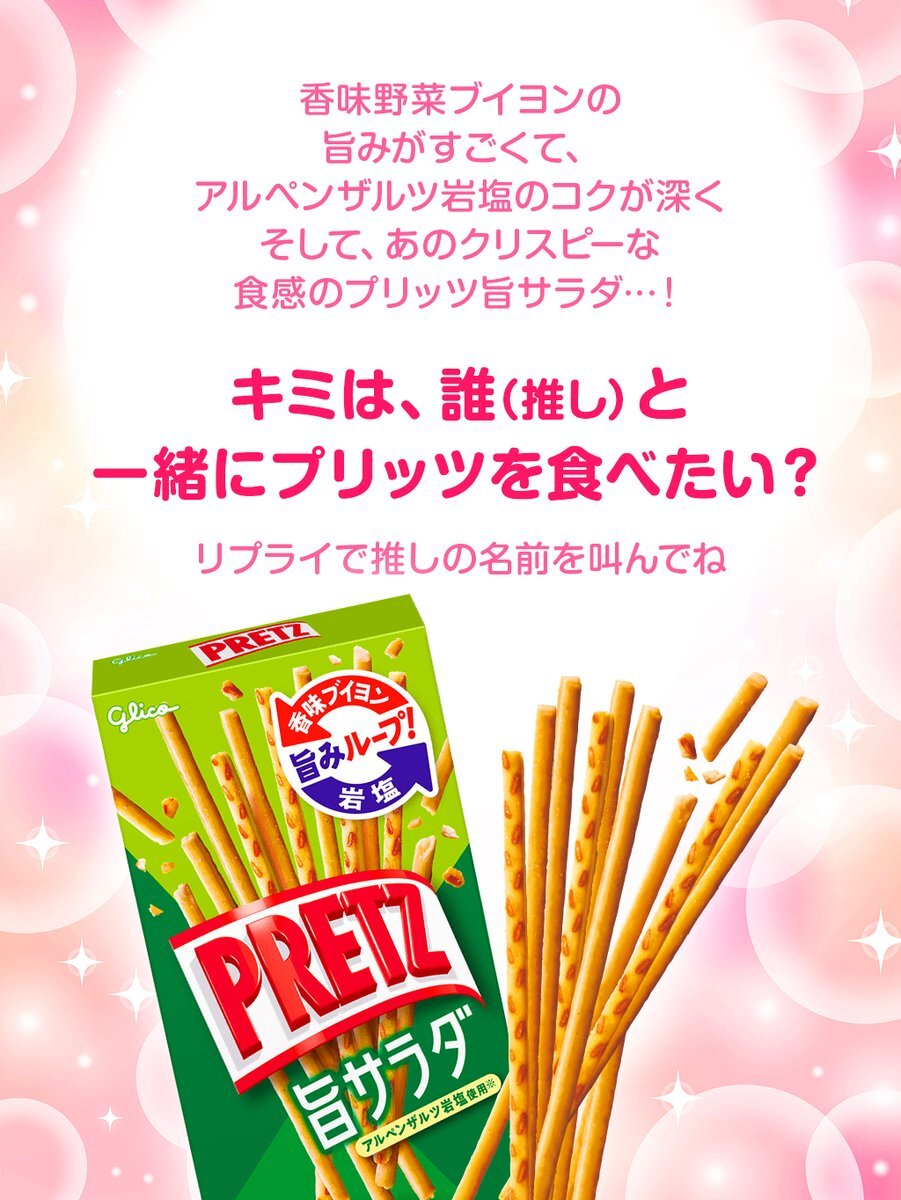 / 今日は #推しの日 📣 \ 香味野菜ブイヨンの旨みと アルペンザルツ岩塩の深いコク クリスピーな食感💚 推しどころ満載の 【旨サラダ】プリッツ 誰(推し)と一緒に食べたい? リプで“推しの名前”叫んでね✨️ #ポッキープリッツの日 に向け 全力で盛り上がり中🔥 #じぶんの時間にどっプリッツ