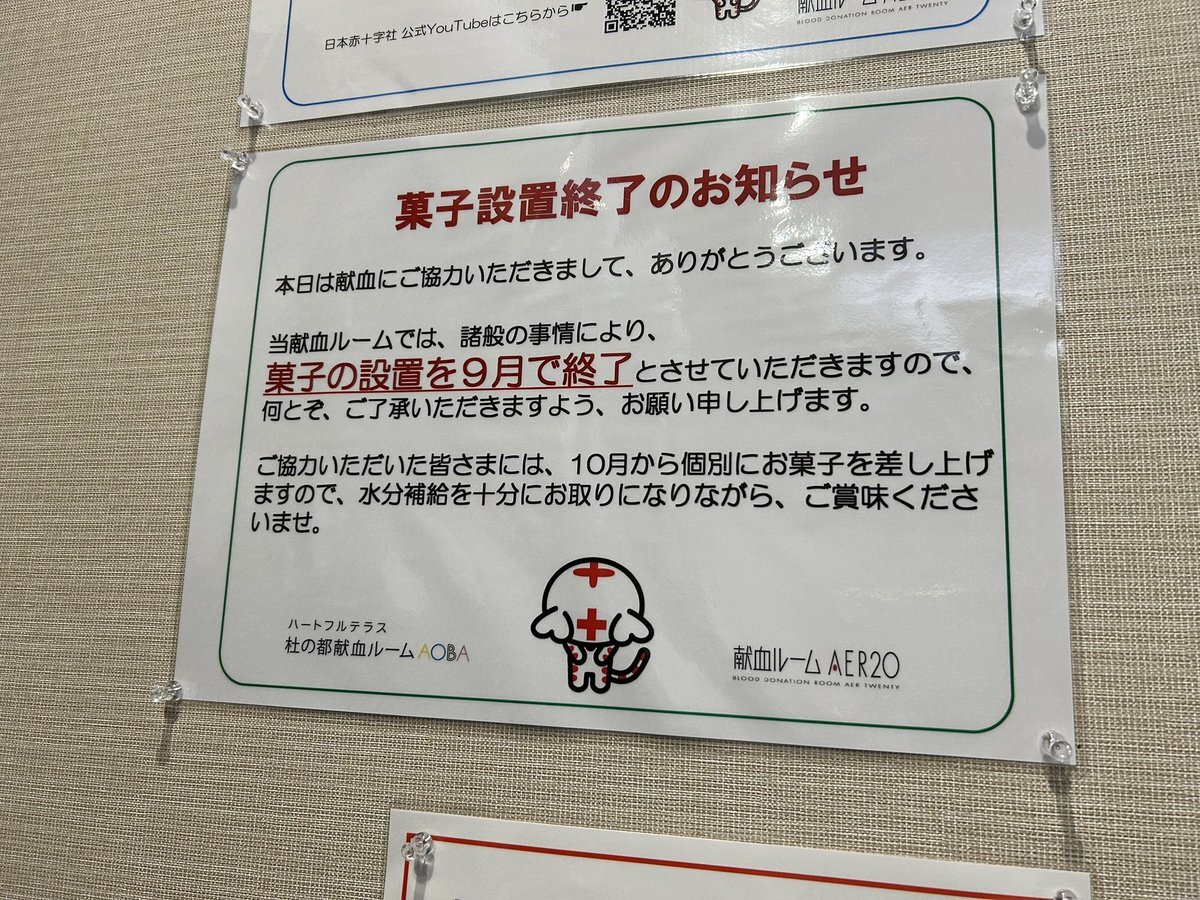 フェミニストが呼びかけた献血ボイコットに対抗して再開した怒りの献血も本日で101回目。 今日は400ml献血を行ったので、次回は11月。 行きつけの献血ルームは、本日でお菓子食べ放題サービスが終了となりました。残念。 そんなに食べられないので問題ないけど。 #日本赤十字社を応援するオタクの会 pic.x.com/jmxRfTzADZ
