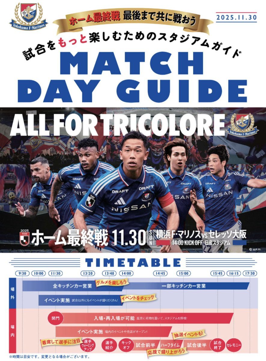 スタジアムで過ごす1日をもっと楽しむための「マッチデーガイド」✨ 11/30 C大阪戦のデジタル版を公開👉 f-marinos.com/matchdayguide/… 選手紹介や、グルメ、イベント等々を事前にチェックして当日を楽しみつくそう🔥 チケット情報💁♂️ bit.ly/40rKYs5 #fmarinos