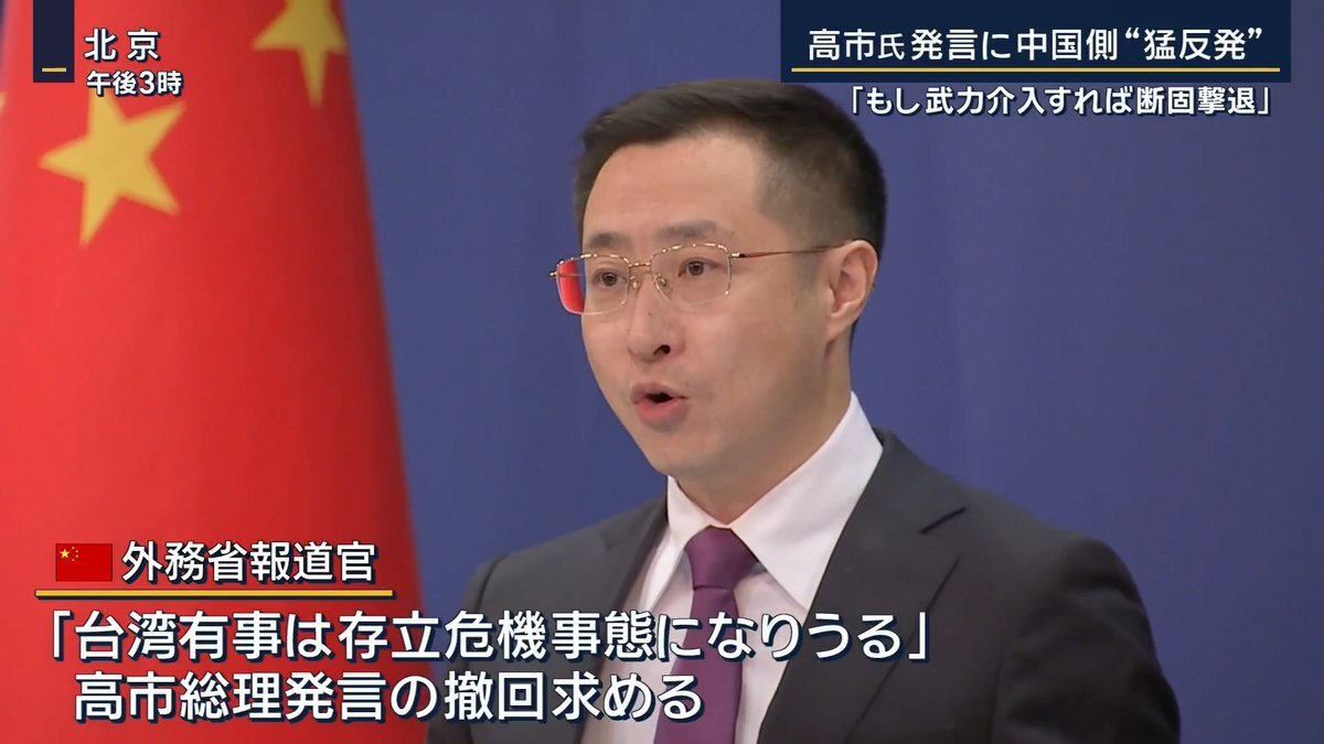 【高市総理の発言に中国側“猛反発”】 | 中国外務省は、台湾有事を巡る高市総理大臣の発言に強い不満を示し、対抗措置をとる可能性を示唆しました 中国外務省 林剣副報道局長 「日本側は直ちに悪質な発言を撤回すべきだ。さもなくば全責任を日本側が負わなければならない」