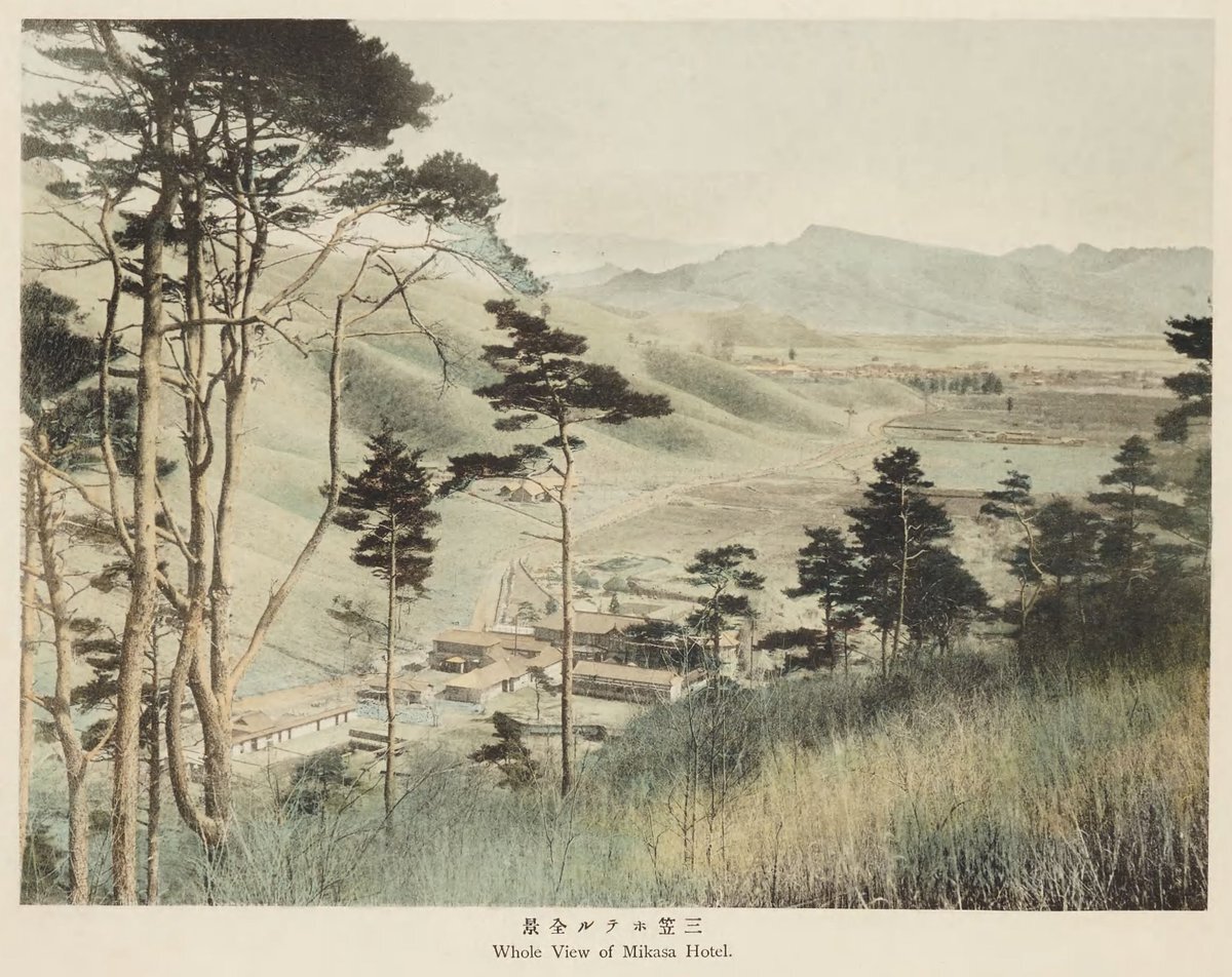 午後なのにおはようございます! 実はこの絵葉書には元ネタがあります。 「敷島美観(下)THE SCENERYS AND CUSTOMS JAPAN. No. II」 という、日本の名所や文化を内外に紹介する書籍に掲載されていました。 三笠ホテルは目次になく最終ページに掲載されているので、入稿締切後に追加されたようです。 x.com/inuchanbt/stat…