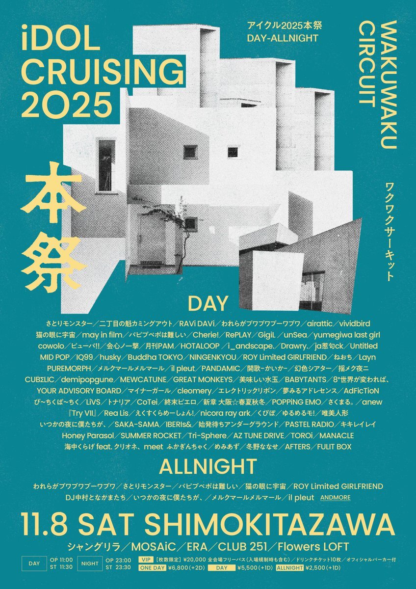 #早寝早起き下北沢 出演者追加】 11/8(土) 『アイクル2025本祭〜WAKUWAKU CIRCUIT〜』 📍会場:シャングリラ/MOSAiC/ERA/CLUB251/Flowers LOFT 🕚DAY開場11:00/開演11:30 🌙NIGHT 開場23:00/開演23:30 🎫t-dv.com/idolcruising20… 🎟️ ・VIP Sチケット pic.x.com/mKPOGTdelV