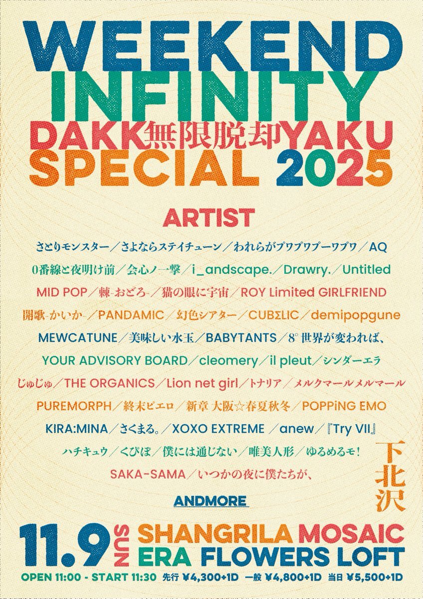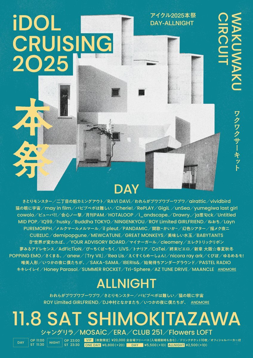 【#早寝早起き下北沢 2DAYS出演者更新】 DAY1 🍁11/8(土) 🎪 アイクル2025本祭 WAKUWAKU CIRCUIT 📍下北沢(シャングリラ/MOSAiC/ERA/CLUB 251/Flowers LOFT) 🕚DAY 11:00 OPEN/11:30 START 🌙ALL NIGHT 23:00 OPEN/23:30 START 🎟️ t-dv.com/idolcruising20… ⏰一般発売:10/16(木)22:00〜