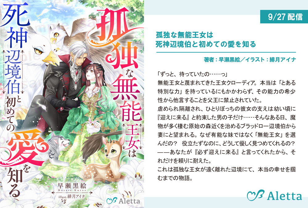 🍀配信開始🍀 📔孤独な無能王女は死神辺境伯と初めての愛を知る #早瀬黒絵 先生 muchubunko.info/sakuhin/hayase… ある事情から特別な力を隠してきたクローディア。無能と蔑まれた彼女の人生は、ブラッドロー辺境伯と結婚したことで一変して……🫢💕 【配信書店様📚】 pic.x.com/saJZ0pysXp