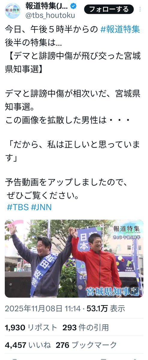 直接受賞したのは別の問題ですが、#報道特集 @tbs_houtoku は、#参政党 が応援した #宮城県知事 選での誹謗中傷問題も取り上げました。参政党所属の #後藤翔太 議員が卒業した #早稲田大学 が、参政党にとって都合が悪い番組を #ジャーナリズム大賞 に選んだことに注目してます。#早稲田大 pic.x.com/4Mc6sudu05 x.com/cult_and_fraud…