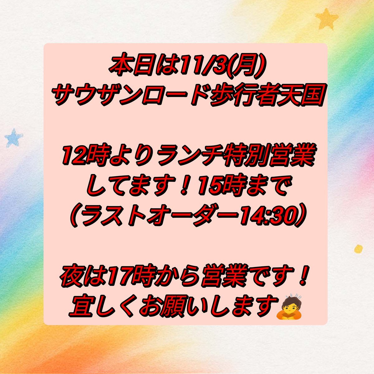 旬鮮酒場NOBUです! 本日はサウザンロード歩行者天国にあわせて 12時より ランチ特別営業しております! 12時〜15時まで(ラストオーダー14:30) 夜は17時から営業 宜しくお願いします! #居酒屋 #サウザンロード #旬鮮酒場nobu  #ランチ #海鮮 # pic.x.com/KtxBYvBMV0