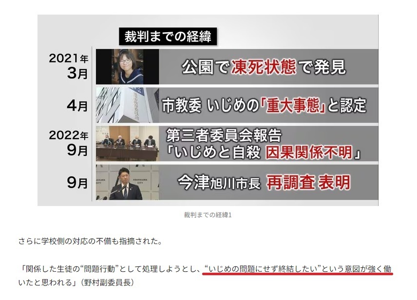 旭川中学生自殺訴訟 自殺を予見出来なかったと市が主張 争点が初めて明らかに(HTB北海道ニュース) #Yahooニュース news.yahoo.co.jp/articles/6c2bc… 遺族側は「学校および市教委が家庭環境などの問題として責任転嫁し、いじめ認知を回避している」と訴えています。 #旭川女子凍死事件の再捜査を求めます