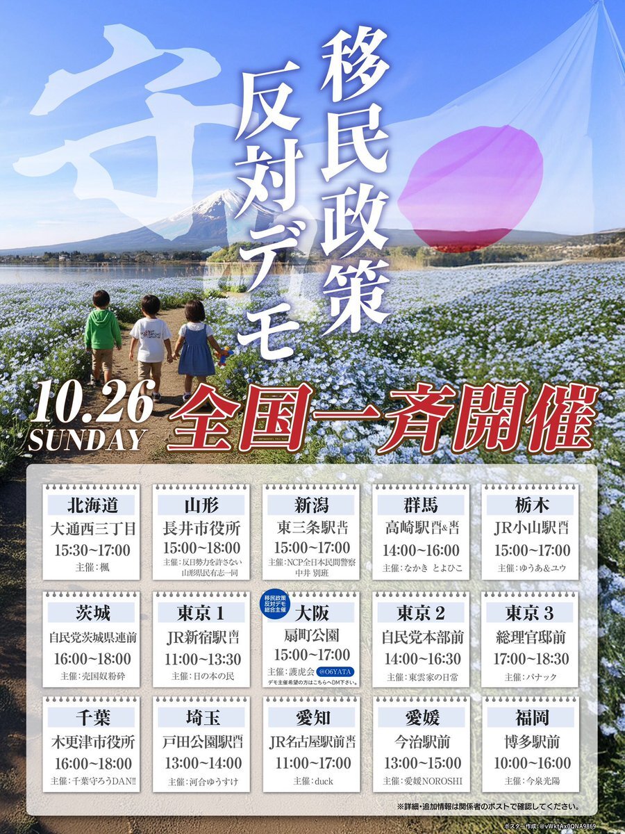 10/26(日)全国一斉!移民政策反対デモ 10/7フライヤー更新しました。 東京は日の本の民さんが入って3部構成。 それから北海道では楓さんが名乗りを上げてくださいました! #移民政策反対デモ