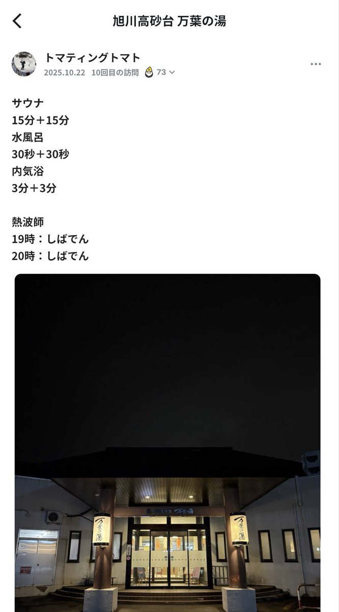 今日は帰る前に、これまたかなりひさしぶりに旭川の万葉の湯に行きました。1セット目100℃のサ室でたまたまジョウロウリュを受けることができました。熱々で最高でした。 水風呂は12.5℃の好きな温度でした。2セット楽しみました😊 #旭川高砂台万葉の湯 pic.x.com/cE4D8tWvIW