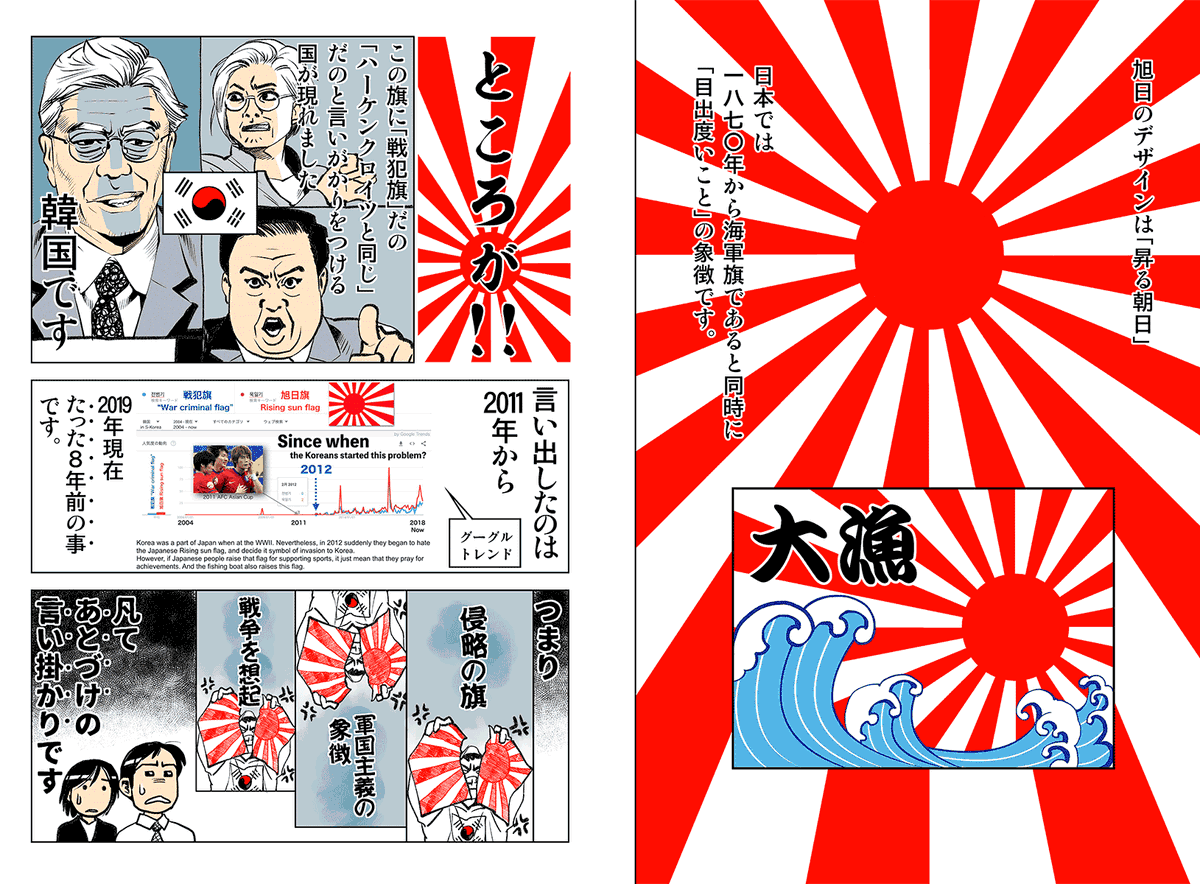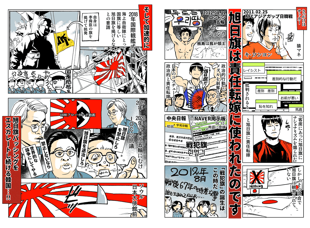 『旭日旗問題に見る韓国ナショナリズムの新側面』 木村 幹 2011 年 8 月『中央日報』記事 日章旗冒涜は外国国旗侮辱で処罰対象 ↓ 海上自衛隊や日本の極右派、スポーツ競技応援等でも旭日旗が使用される ↓ 侮辱対象を #旭日旗 へ。国旗じゃないからセーフ❗️の動きあり research.kobe-u.ac.jp/gsics-publicat…