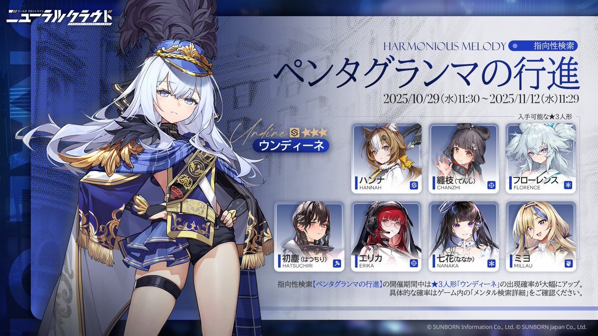【ウンディーネ 出現率UP】 「10月29日(水) 11:30」より、★3ユニーク「ウンディーネ(CV: #明坂聡美)」の出現率がアップする指向性検索「ペンタグランマの行進」が開催。 サイバーメディアが開発した儀仗楽団人形「ウンディーネ」を入手しましょう。 #ニューラルクラウド pic.x.com/uPALhnw0vJ