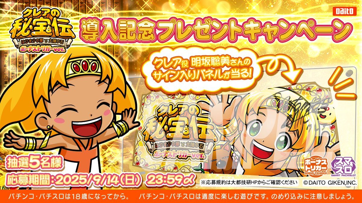 『クレアの秘宝伝 ~はじまりの扉と太陽の石~ ボーナストリガーver.』導入記念キャンペーン開催🎁 / #クレア 役 #明坂聡美 さんのサイン入りパネルが当る⁉ \ 参加方法 ①@DAITOGIKEN_JP をフォロー ②この投稿をリポスト 期間 2025/9/14(日)23:59まで ▼応募規約 daitogiken.com/regulations/ca… pic.x.com/NcpfedZQcJ