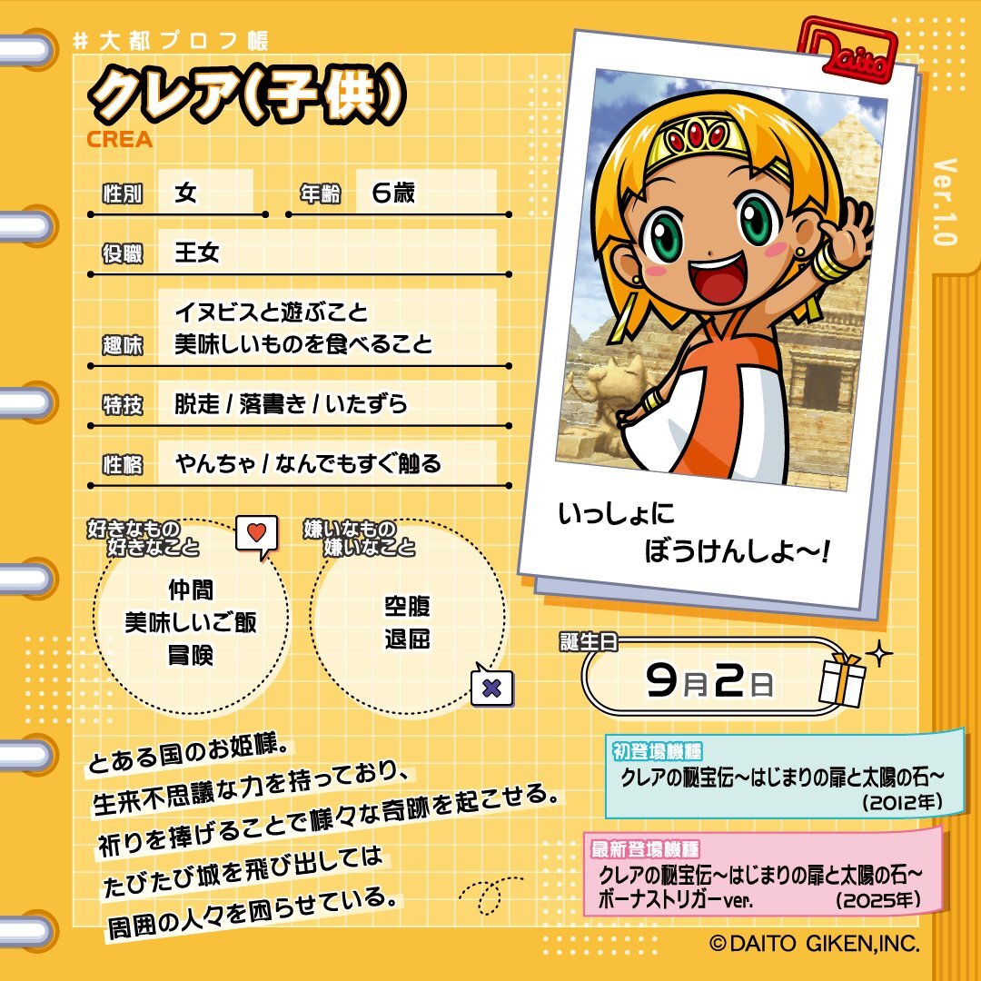 大都技研キャラクターの プロフィールを大公開‼️ ☀️──────── クレア(子供) CV:#明坂聡美 ────────☀️ #大都プロフ帳 #クレアの秘宝伝 pic.x.com/QuBvfabSow