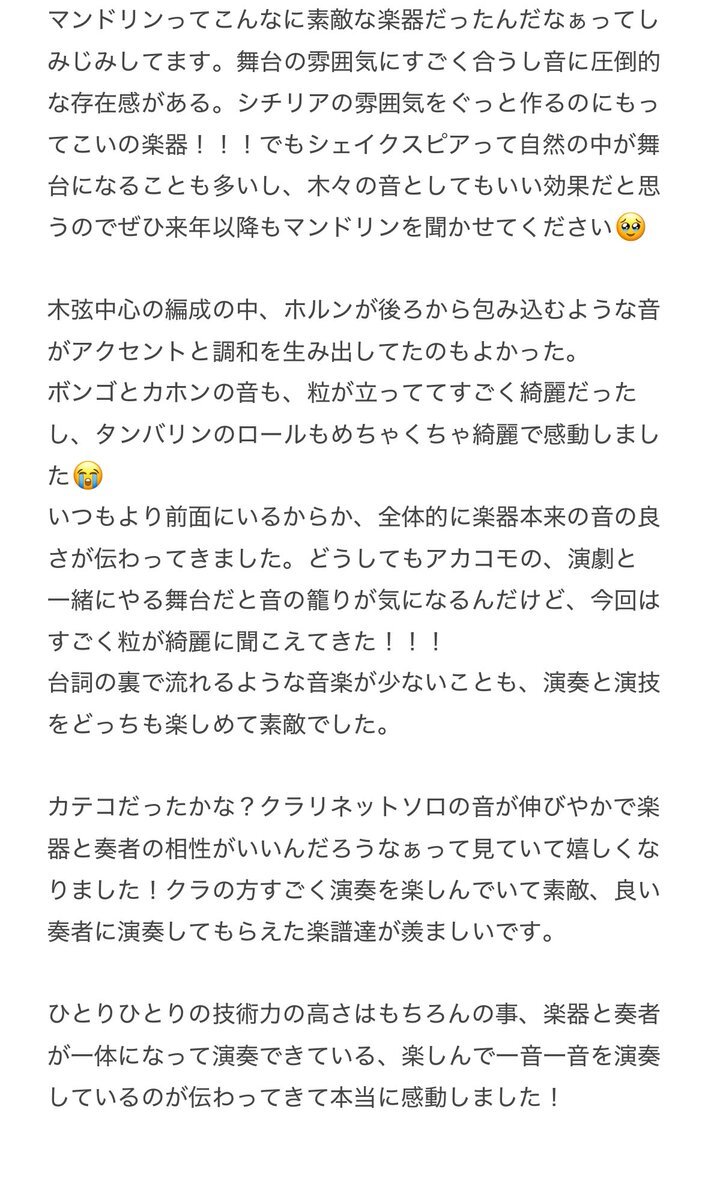 #明治大学シェイクスピアプロジェクト #冬物語 レオンティーズ役とオートリカス役の同期が舞台に立っている姿がほんとうに大好きなのですが、今回も観客の目を独占しちゃうような最高の演技でした😭 楽器隊の感想は2枚目。やっぱクラベスを導入すべきだと思うんですよmspは。 pic.x.com/efWiyZ8H5J