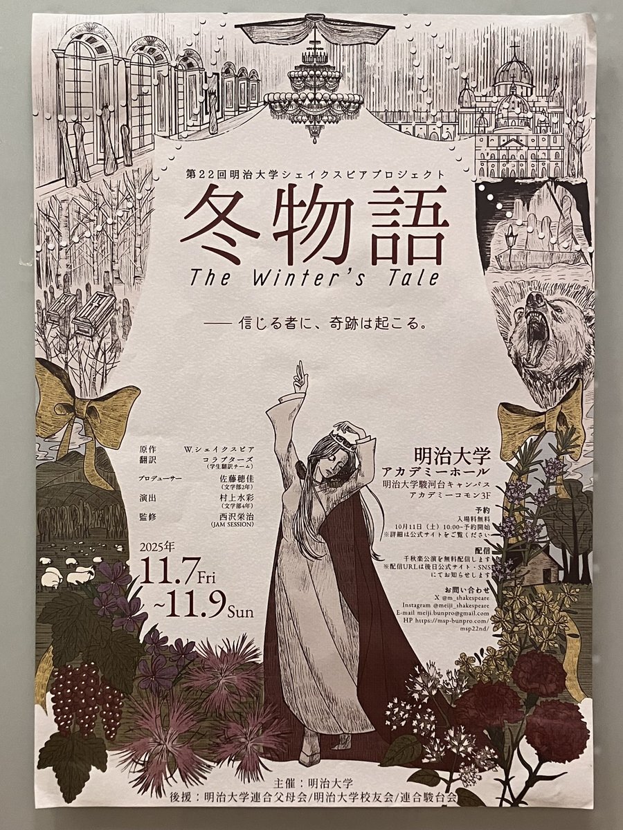 昨日見てきました! MSP初めて見たけどすごく良かったです! 終始その世界観に引き込まれました。 この後17時からの千秋楽は生配信もあるみたいなのでぜひ。 #明治大学シェイクスピアプロジェクト #明治大学 #学生演劇 #冬物語 #MSP pic.x.com/1U4KVjMNYM