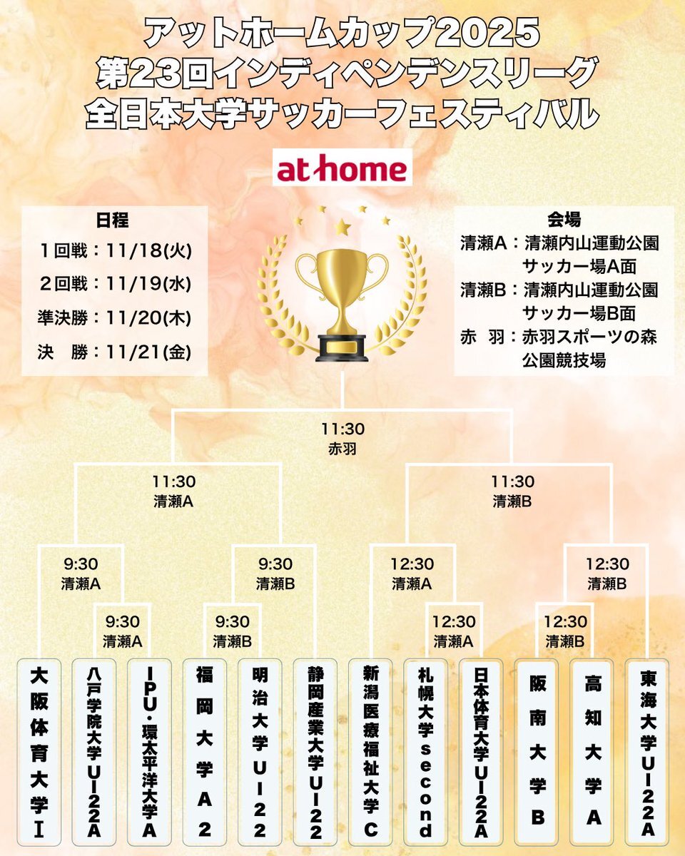\11/18(火)開幕✨/ 『アットホームカップ2025 第23回インディペンデンスリーグ全日本大学サッカーフェスティバル』 各地域の予選を勝ち抜いた12チームが戦います🔥 #jufa #大学サッカー #インディペンデンスリーグ #アットホームカップ #アットホーム
