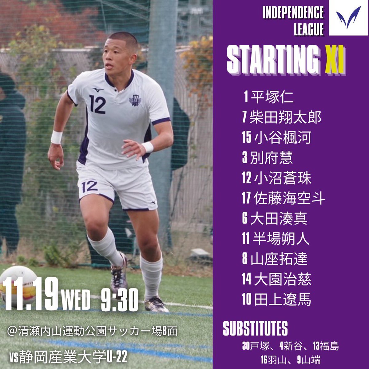 🏆インディペンデンスリーグ 全日本大学サッカーフェスティバル 2回戦 🆚静岡産業大学U-22 🕒9:30 kick off 🏟清瀬内山運動公園サッカー場B面 《スタート》 1平塚、7柴田、15小谷、3別府、12小沼、17佐藤、6大田、11半場、8山座、14大園、10田上 《サブ》 30戸塚、4新谷、13福島、16羽山、9山端