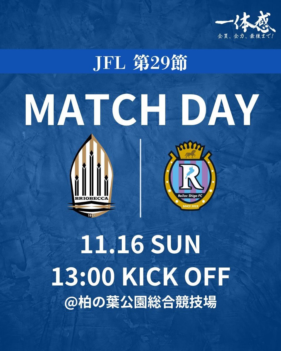 🔵 MATCH DAY ⚪️ \\ JFL 第29節 // supported by #明治安田 🕒11月16日(日)13:00キックオフ 🆚 #レイラック滋賀 🏟 柏の葉公園総合競技場 YouTube配信はこちらから youtube.com/live/Ie-TQ03Nj… #briobecca #JFL