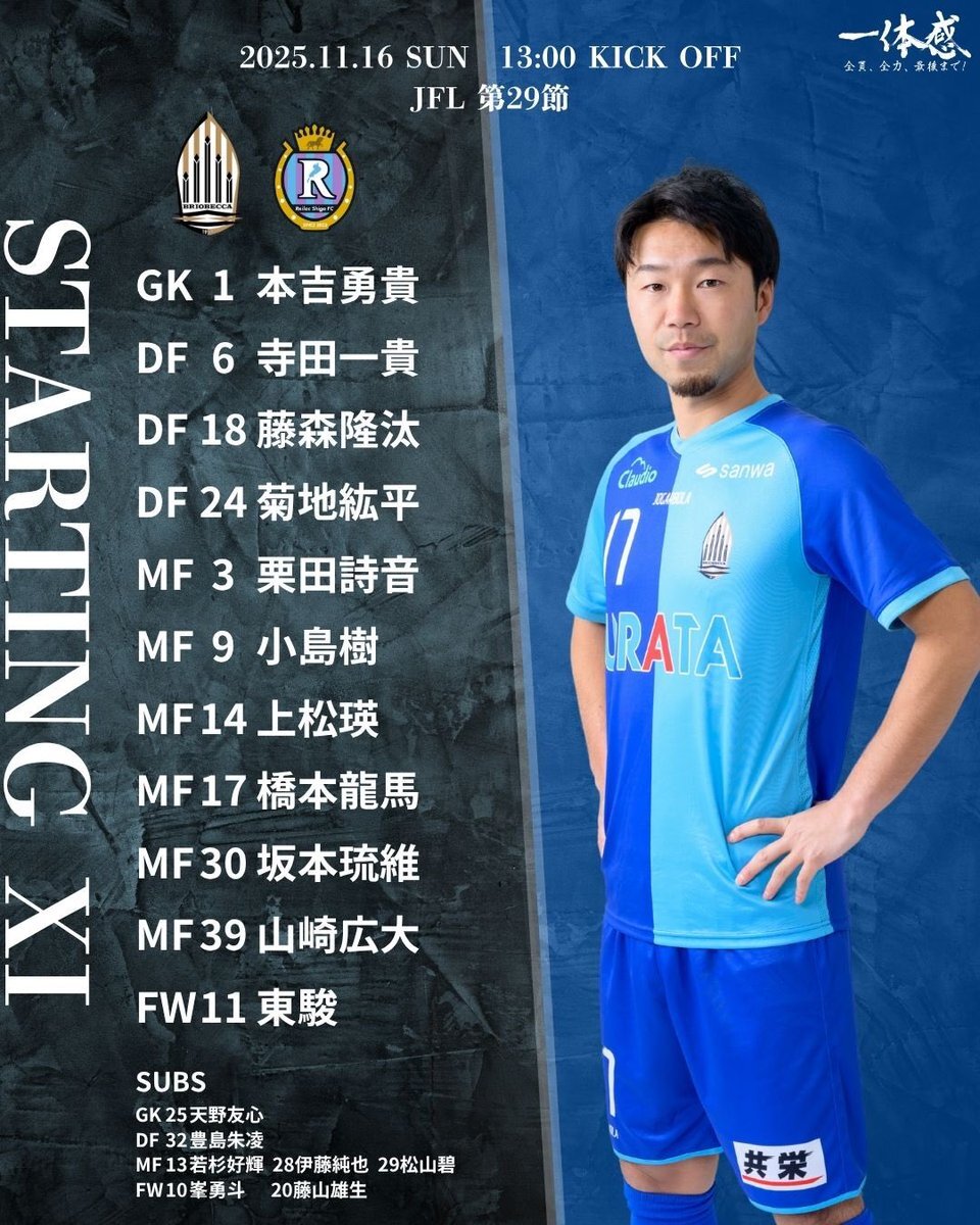 🔵JFL第29節 STARTING XI⚪️ \\ JFL 第29節 // supported by #明治安田 🕒11月16日(日)13:00キックオフ 🆚 #レイラック滋賀 🏟 #柏の葉公演総合競技場 全員!全力!最後まで!! YouTube配信はこちらから youtube.com/live/Ie-TQ03Nj… #briobecca #一体感 #JFL #浦安 #市川 pic.x.com/4u0N14uYU5