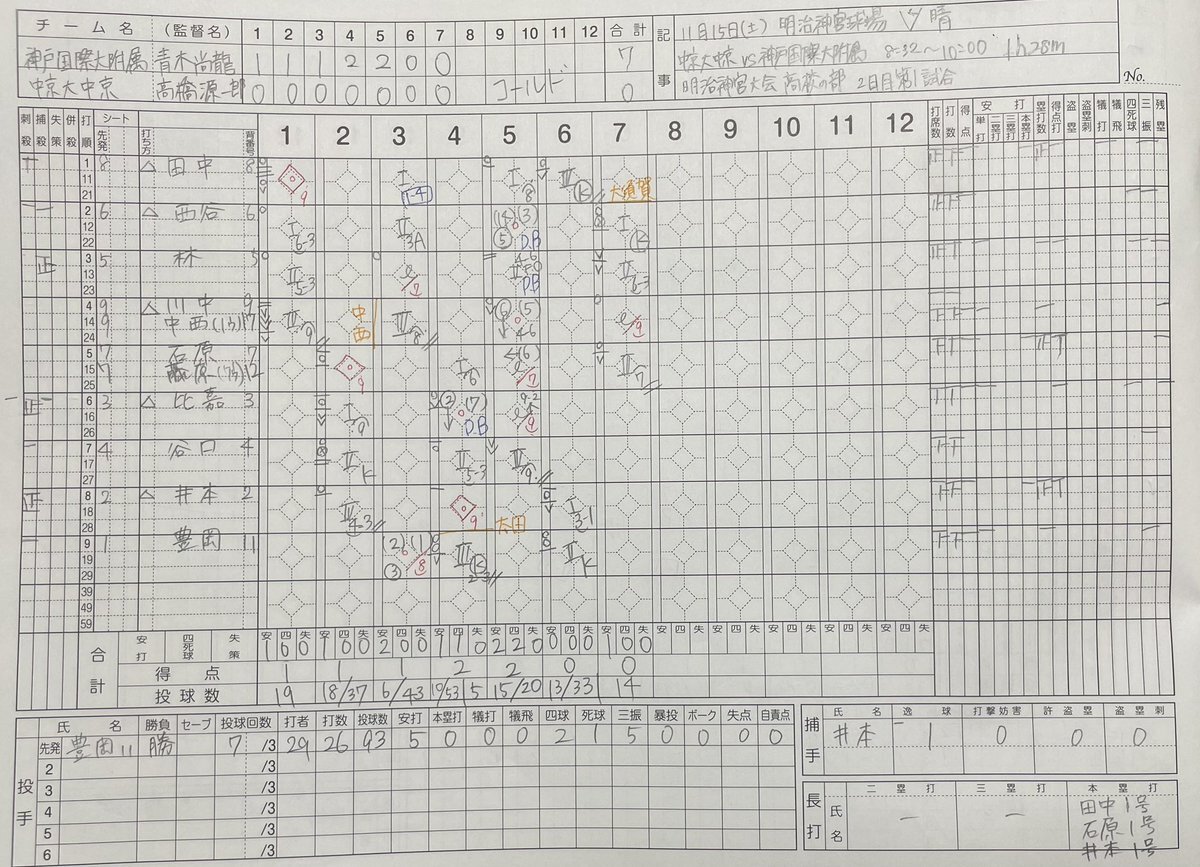 #明治神宮大会 2回戦 神戸国際大附7−0中京大中京(7回コールド) 神戸国際大附は田中君・石原悠資郎(ゆうじろう)君・井本君、見事な3本塁打などで圧勝! 中京大中京は残念ながらあらゆる面で近畿王者との差を感じる完敗でした… x.com/fukudasun/stat…