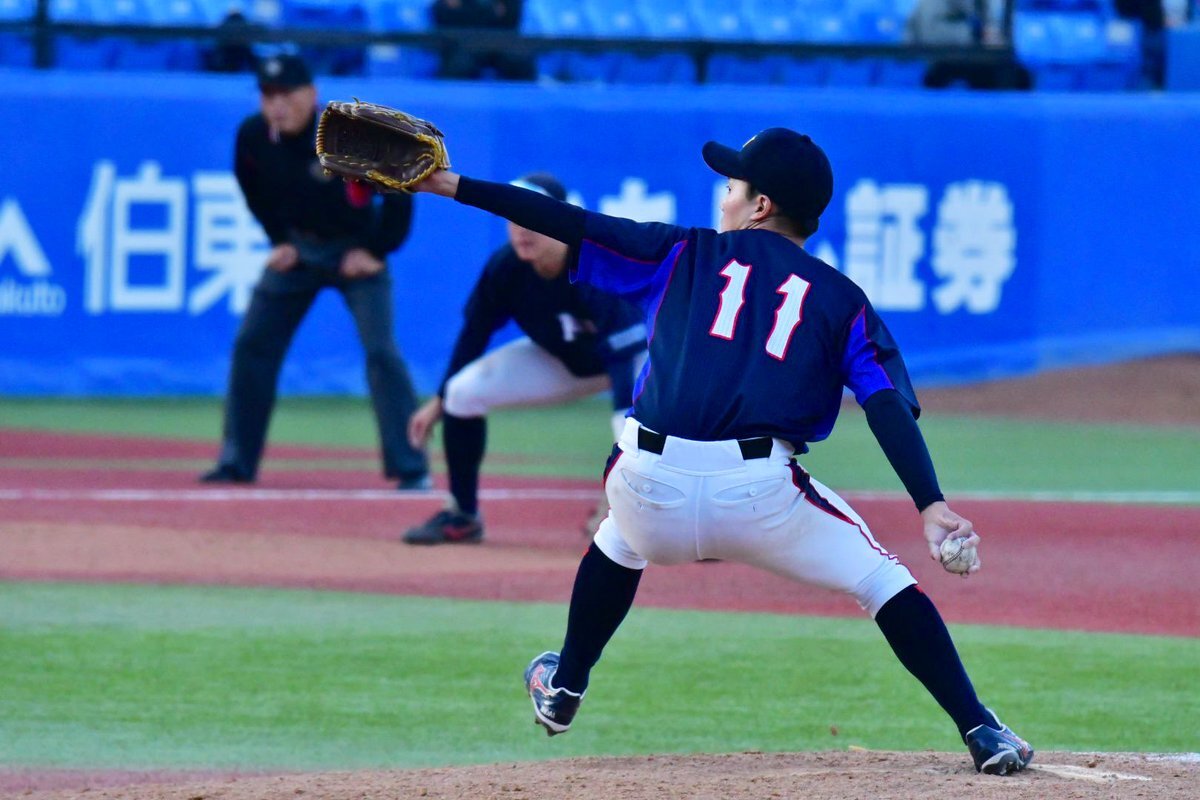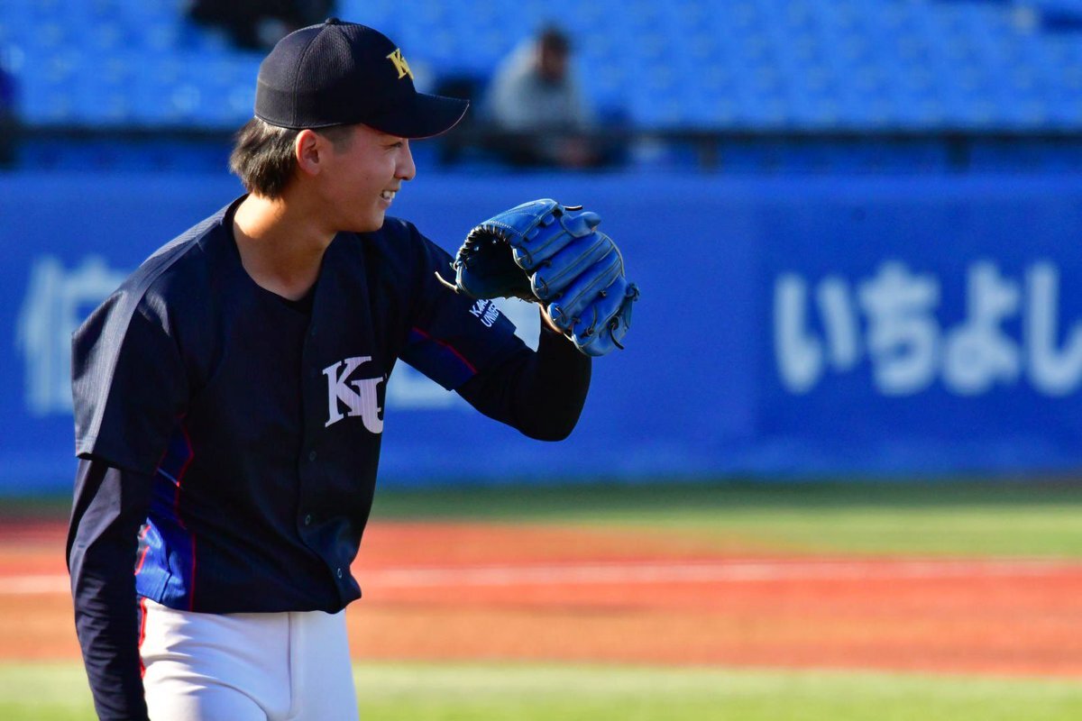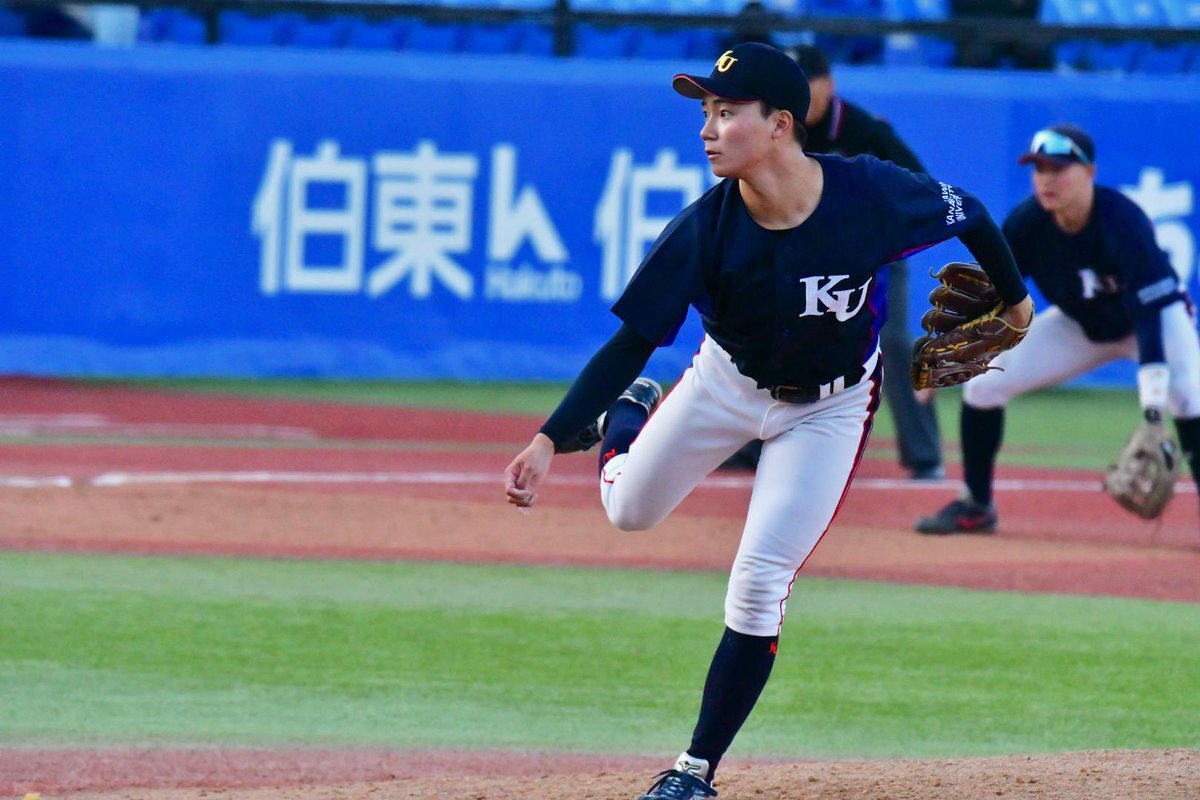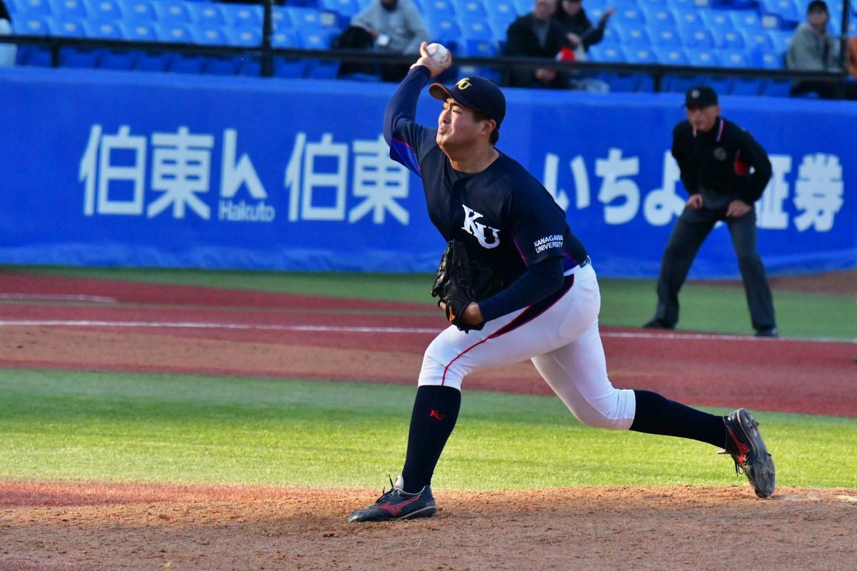 [11/15 明治神宮大会] 神奈川大 #18 松平快聖(市原中央高) 不安定な立ち上がりもなんとか最小失点に抑えて4回まで投げた 打席でもタイムリー二塁打を放った! やはり彼が神大のエースだね! #明治神宮大会 #神奈川大学 pic.x.com/kiZAfZgZVU