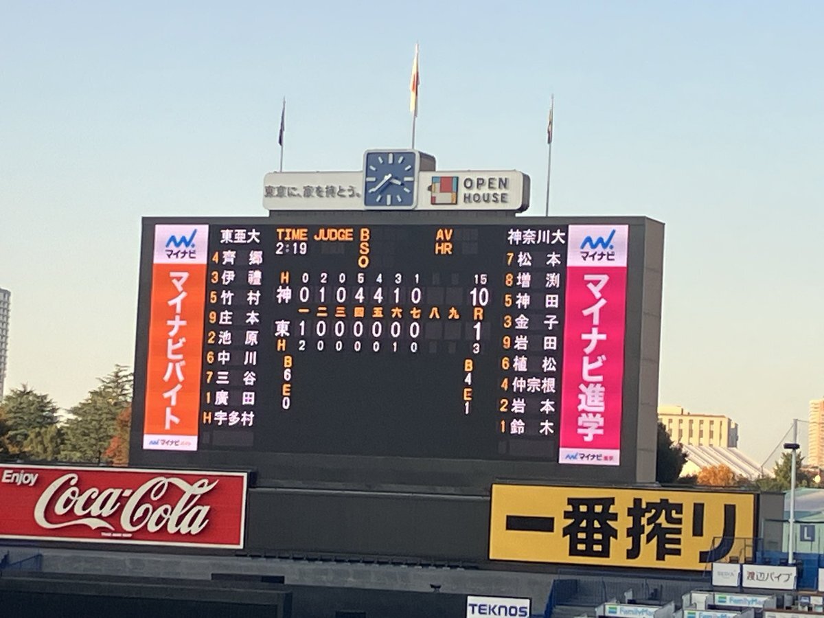 本日の明治神宮球場 大学の部 第三試合 神奈川大 10 - 1 東亜大 7回コールド 第四試合 杏林大 2 - 3× 名城大 10回タイブレークサヨナラ 名城大の勝機は8回表1.2塁のピンチで代走が出され0点に抑えたとこでしょうか🌟 ナイスゲームでした #明治神宮大会 #高校野球 #大学野球 pic.x.com/kt2sCLQXry