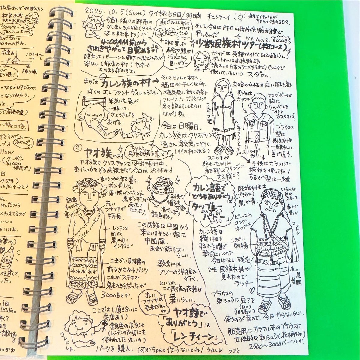 タイ旅2025旅絵日記6日目/39日間(10/5) 少数民族の村を巡る半日ツアーに行った話 オススメ! 充実し過ぎて3ページになってしまった。 #イラスト # #旅絵日記 #タイ #昔の旅をなぞる旅 #タイ北部 #タイ中部 #チェンライ #少数民族博物館 #民族衣装 #村巡りツアー #カレン族 #ヤオ族 #アカ族 pic.x.com/LcT7TH7sY1
