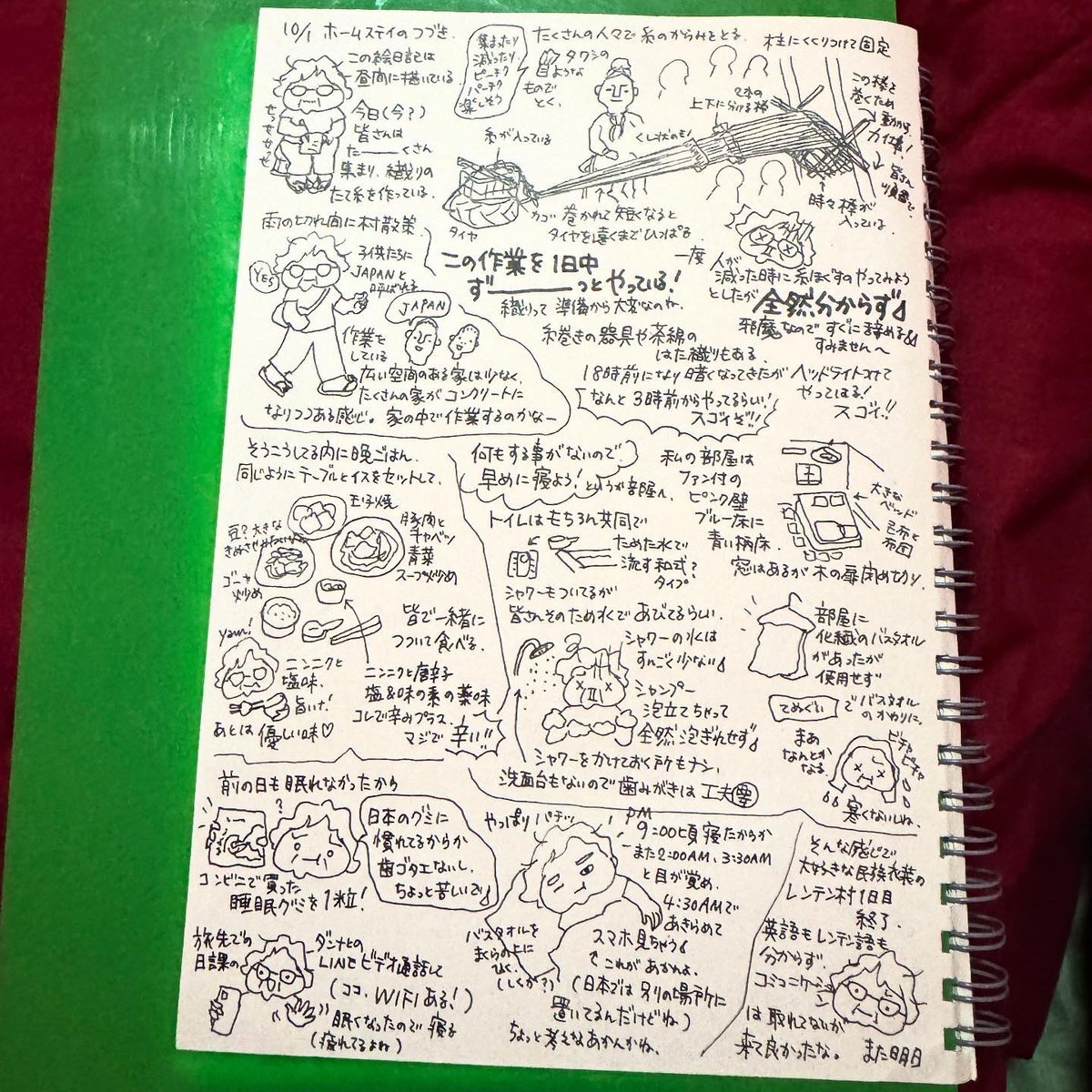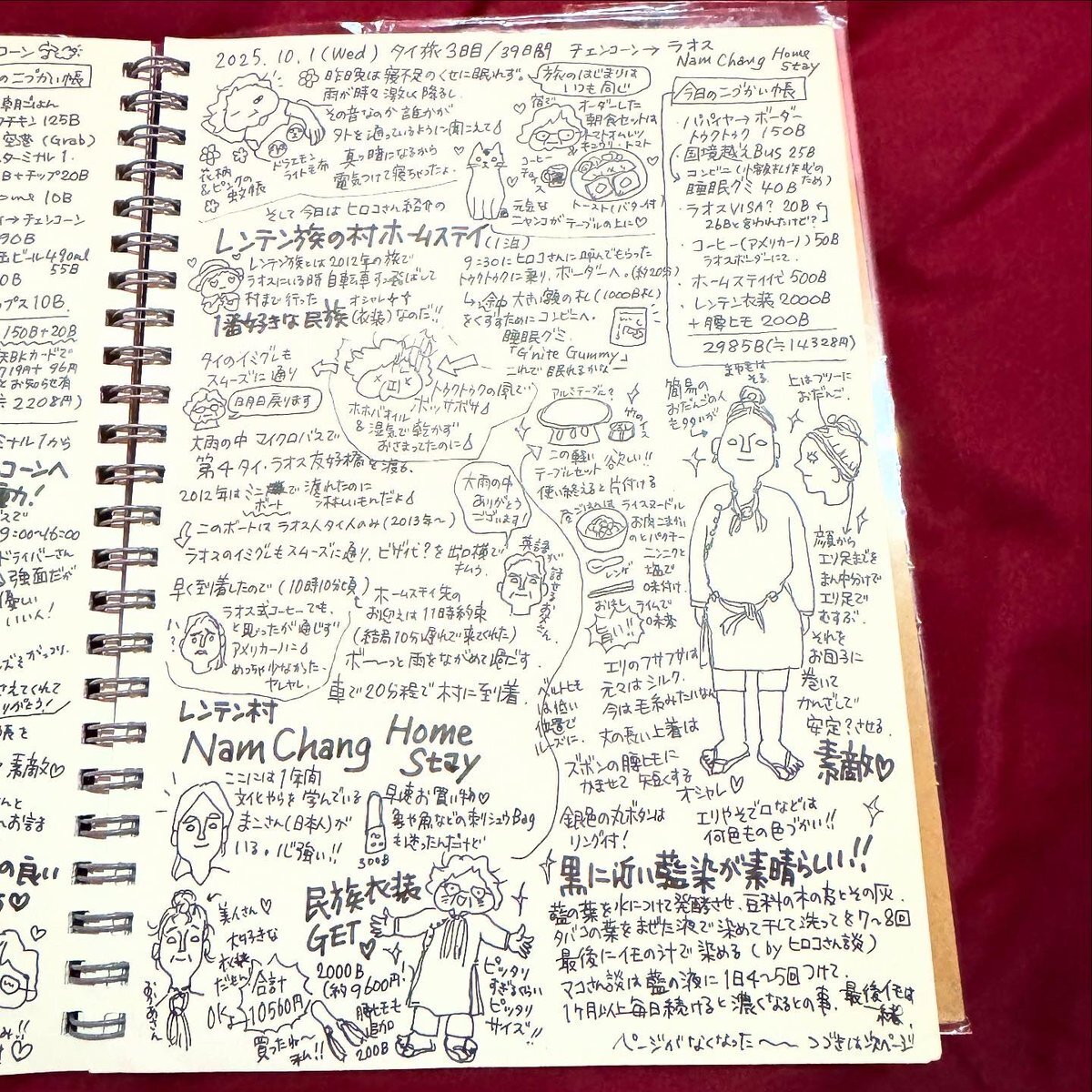 タイ旅2025旅絵日記3日目/39日間(10/1) 大好きなレンテン族の村ホームステイ 素敵衣装の人達がわんさかいて、織の準備をしているのを眺める1日♡ #イラスト # #旅絵日記 #タイ #昔の旅をなぞる旅 #タイ北部 #雨季 #チェンコーン #ラオス #国境越え #レンテン族 #ホームステイ #民族衣装 pic.x.com/17jL2L6Yb0